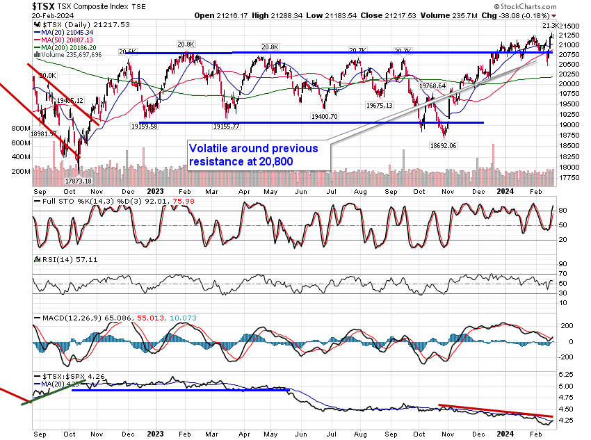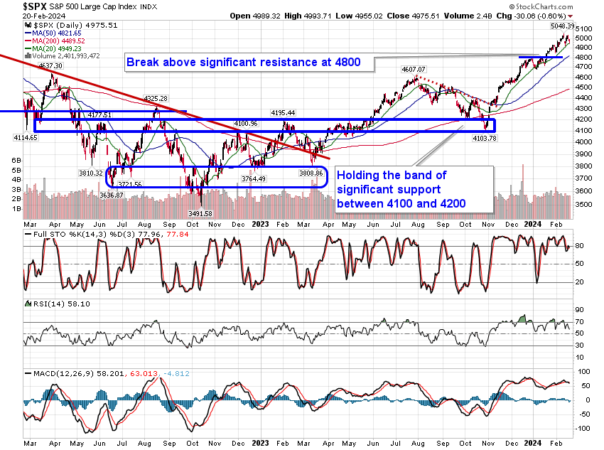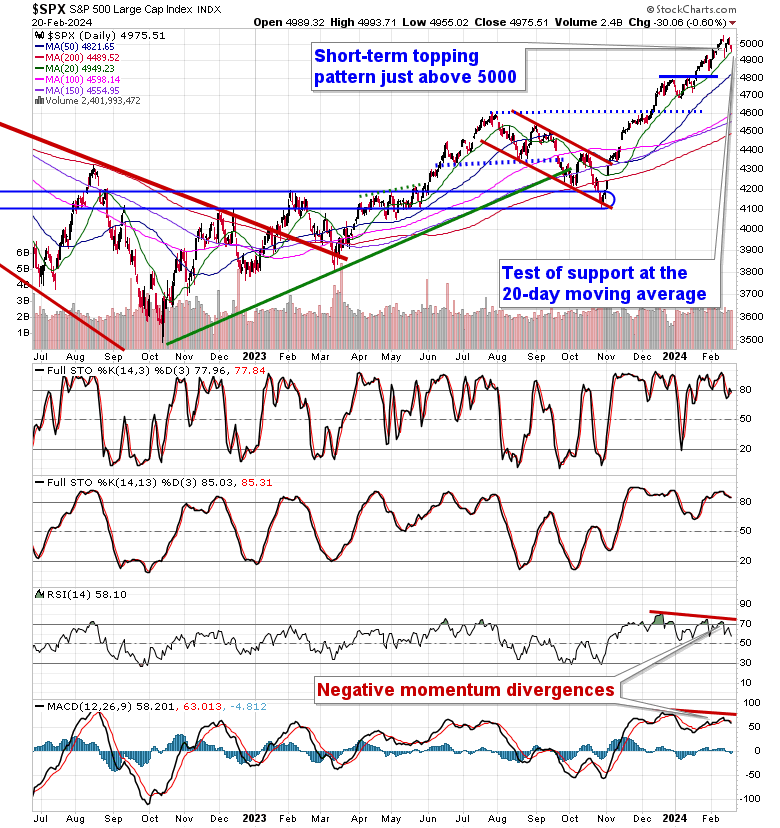 Stocks pulled back on Tuesday as traders booked profits in many of their winners in the technology sector as the one of the weakest two week stretches of the year for the market gets underway. The S&P 500 Index closed lower by six-tenths of one percent, reaching back to short-term support at the 20-day moving average (4948). Tuesday’s downturn starts to confirm a short-term lower-high below the peak set at 5048 on February 12th and another downside gap at 5000 emphasizes the significance of this level to market participants. Momentum indicators (MACD and RSI) continue to show a negative divergence versus price, highlighting waning buying pressures at these market heights, setting the stage for the short-term pullback that is now underway. Despite the high likelihood of the near-term pullback, aligning with seasonal norms for the back half of February, intermediate-term technical indicators remain positive with momentum indicators holding predominantly above their middle lines and major moving averages trending higher above one another. As highlighted in our Market Outlook last week, levels down to 4600 on the large-cap benchmark are fair game as part of a near-term pullback, although a heightened level of scrutiny will be given around the previous all-time high and suspected support at 4800. A correction of 5% to 10%, which a pullback to 4600 would represent, is normal in any intermediate-term bull market trend and we are likely seeing the start of this evolution now. The period of seasonal weakness in the equity market spans the last couple of weeks of February, setting the stage for the positivity that is normal in March and April, leading to the peak of the best six month period for stocks that began in October. A conservative stance to equity positioning in the near-term appears prudent, while intermediate term the weakness is likely to lend to renewed buying opportunities.