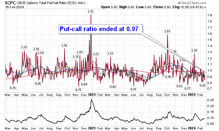 Sentiment on Tuesday, as gauged by the put-call ratio, ended close to neutral at 0.97.