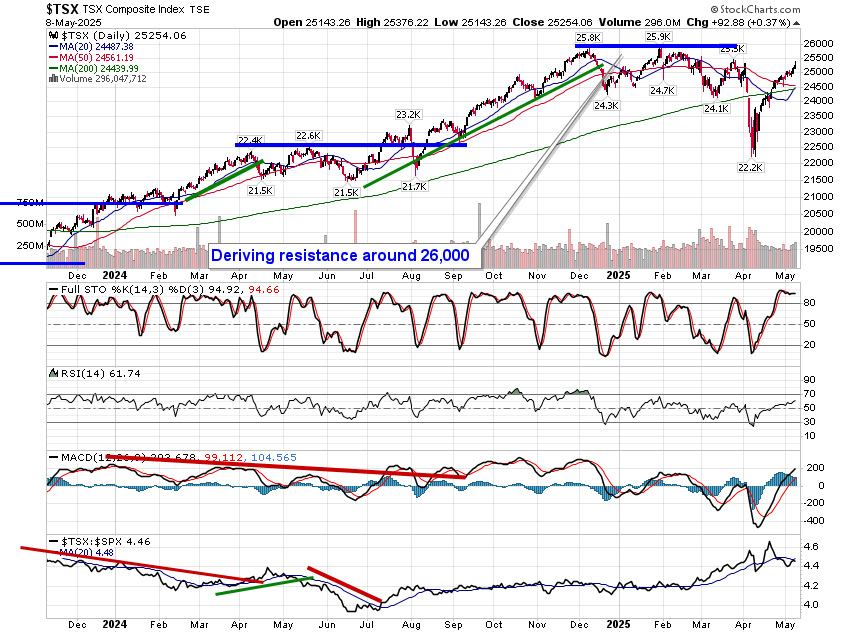Stocks drifted higher on Thursday as the US announced its first major trade deal amidst its tariff rollout and as investors braced for any news that may come out over the weekend when trade representatives between the US and China meet in Switzerland. The S&P 500 Index added just less than six-tenths of one percent, continuing to show reaction to a point of horizontal resistance at 5650. The 200-day moving average remains overhead and the significant doji indecision candlestick charted during the Thursday’s session hints that traders are paying attention to the hurdle. There remains an implied cap over this market in the range between 5500 and 5800, corresponding with the span of the cloud of major moving averages that was broken in March, that would likely require a catalyst to break (eg. progress towards a trade deal with China); without one, look for the sellers to step in around this zone. We were enticed to use the strength through the end of last week to start legging out of equity allocations heading into the offseason for stocks that begins at this time of year as we brace for the next evolution of the intermediate-term trend in the equity market that is still leaning negative. We continue to monitor the potential impact of the rotation in the market on our list of candidates in the market to Accumulate and to Avoid, but we have found rotation/buying candidates in recent weeks amidst this market tumult.