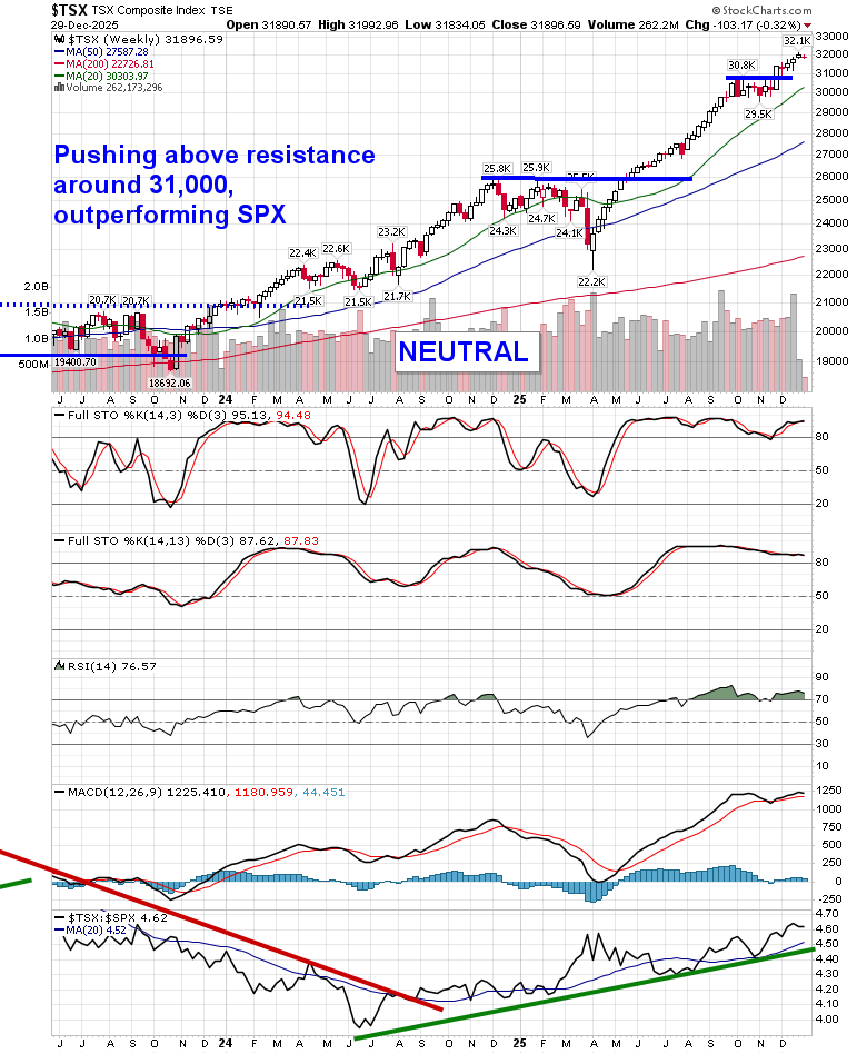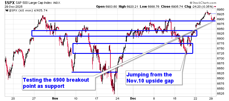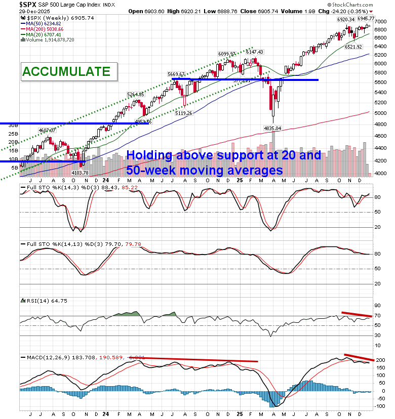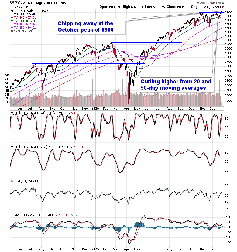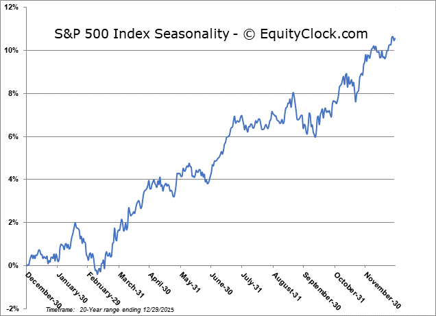 Stocks slipped slightly in the final Monday session of 2025 as technology and metal stocks underwent profit-taking pressures. The S&P 500 Index declined by around a third of one percent, testing the recently broken level of horizontal resistance presented by the prior 52-week closing highs around 6900. The benchmark remains firmly elevated above prior zones of gap resistance around 6750 and 6830, presenting plenty of leeway before a more threatening technical setup would be presented. Underlying support at major moving averages and positive year-end tendencies suggest a move towards the psychologically important 7000 level that is now around 1.4% overhead; traders love to pin markets and stocks into these important levels during these significant seasonal timeframes. In the Seasonal Advantage Portfolio that we oversee at Castlemoore, we have been fully invested in the equity market since December 18th and the themes in our chart books to either Accumulate or Avoid have been capturing the strength that has leached into the market from the November 20th lows.