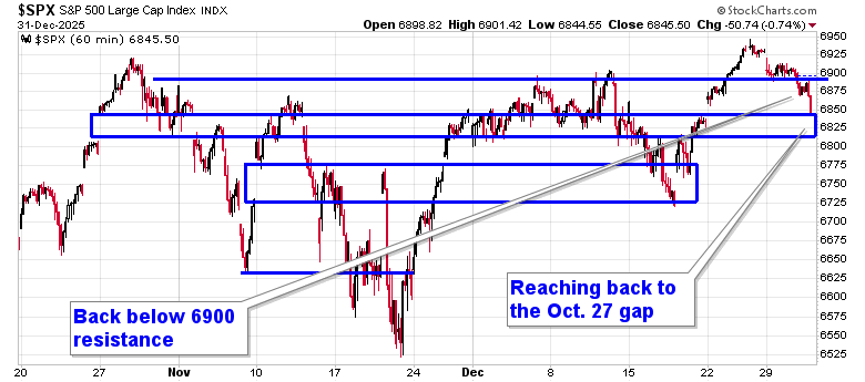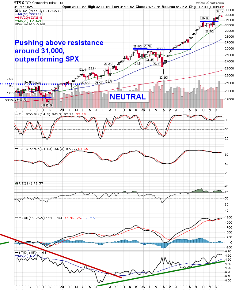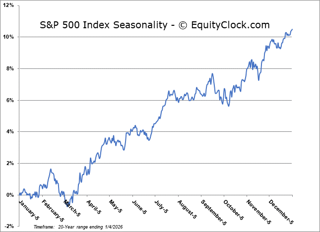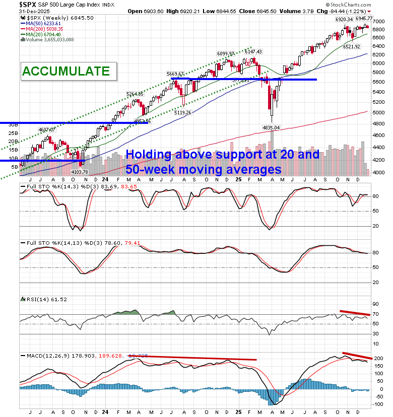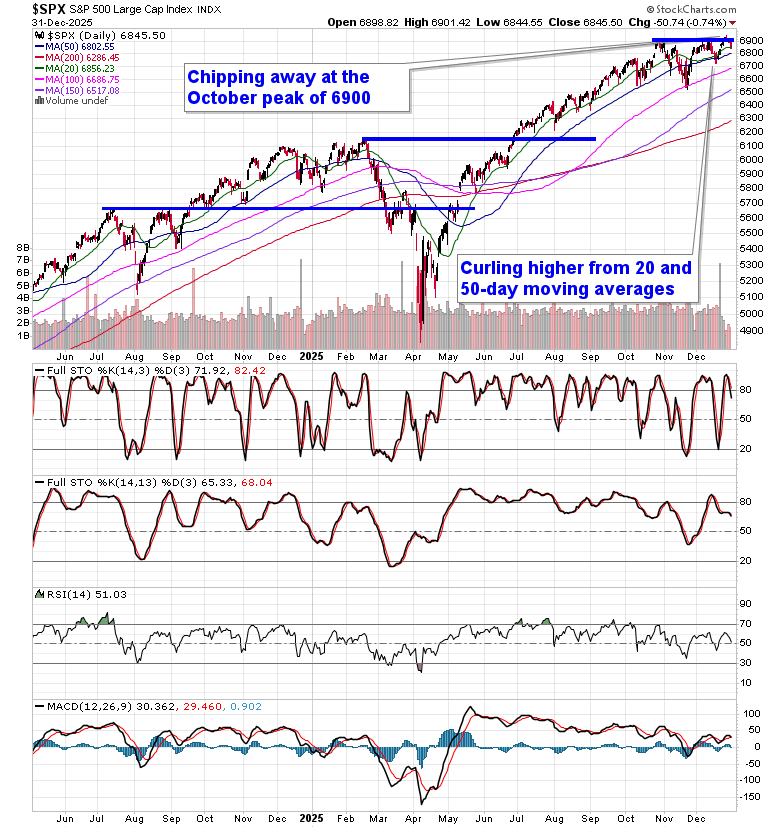 Stocks closed lower in the last session of 2025 as traders used the last minutes of the year to conduct final portfolio rebalancing trades.  The S&P 500 Index declined by around three-quarters of one percent, slipping back below horizontal resistance presented by the prior 52-week closing highs around 6900.  The 20-day moving average at 6856 is being tested.  The benchmark remains firmly elevated above prior zones of gap resistance around 6750 and 6830, presenting plenty of leeway before a more threatening technical setup would be presented.  Underlying support at major moving averages and positive year-end tendencies continue to suggest a move towards the psychologically important 7000 level, so long as the selling pressures that have filtered into the market in recent days do not continue into the first few days of the new year; traders love to pin markets and stocks into these important levels during these significant seasonal timeframes.  In the Seasonal Advantage Portfolio that we oversee at Castlemoore, we remain fully invested in the equity market and the themes in our chart books to either Accumulate or Avoid have been capturing the strength that has leached into the market from the November 20th lows.
