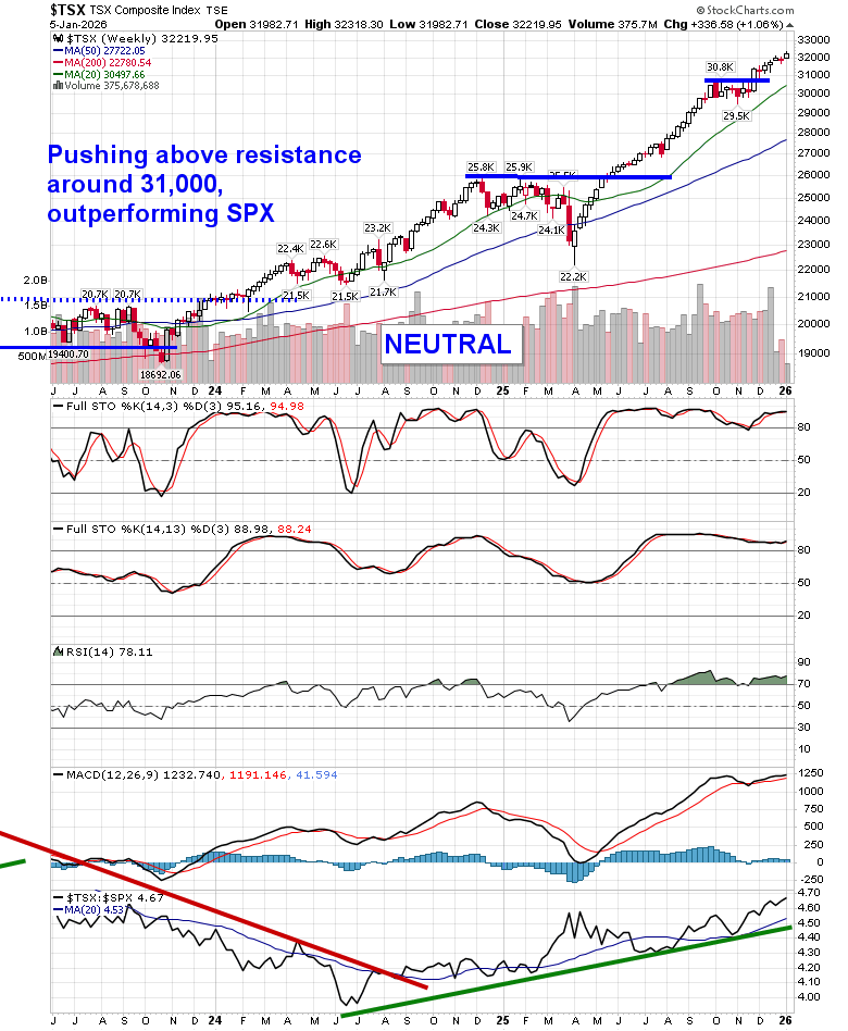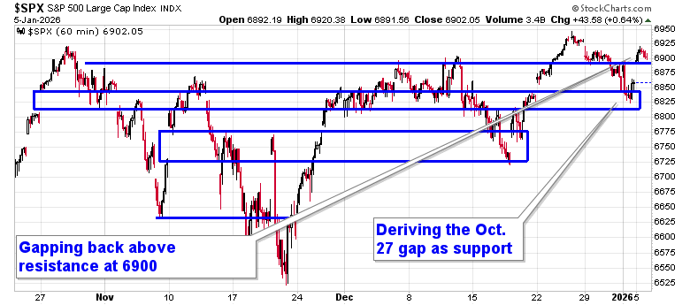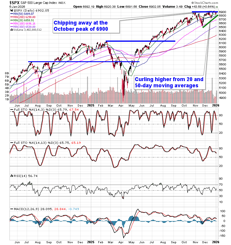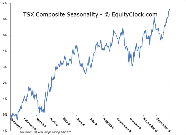 Stocks shook off concerns pertaining to the escalation of geopolitical tensions and pushed higher heading into the first full week of 2026. The S&P 500 Index posted a gain of around two-thirds of one percent, gaping back above horizontal resistance presented by the prior 52-week closing highs around 6900. The benchmark continues to advance off of moving average support presented by the 20 and 50-day, providing variable hurdles that traders have been willing to step in around. End of October gap resistance is now turning into support around 6830 and, until it is broken, playing on the long-side of this market remains appropriate. The end of the Santa Claus rally period (according to our definition of the span) is near and the period is still firmly positive (up ~1.25%); barring a shock through the days ahead, the broad market seasonal play looks set to close out with a return that is inline with the average performance between December 15th and January 6th. In the Seasonal Advantage Portfolio that we oversee at Castlemoore, we remain fully invested in the equity market and the themes in our chart books to either Accumulate or Avoid have been capturing the strength that has leached into the market from the November 20th lows.