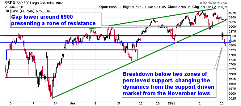Stocks sold off sharply on Tuesday as the rise of geopolitical tensions amidst a re-escalation of tariff rhetoric had investors looking to de-risk. The S&P 500 Index closed down by just over two percent, breaking below the prior 52-week closing highs around 6900, as well as the end of October gap resistance turned support around 6830. The narrowing range that we have been profiling for the past month has been broken. A downside gap around 6900 applies a level of resistance to scrutinize through the days ahead. Our triggers that we have spelled out to trim equity exposure have been hit, but there is little desire to participate in selling into a panic. Prior to Tuesday’s session, the market was showing greater respect to levels of support than to levels of resistance, but Tuesday’s price action threatens to flip this stance. A recovery into the aforementioned zone of gap resistance (~6900) through the days/weeks ahead that gets sold into would provide the more opportune time to lighten up on equity exposure, bracing for the kind of volatility that is average around this time of year. For now, we know that Trump’s negotiating style is to always reach for the most aggressive ask, only to tamper down rhetoric to achieve an outcome that is aligned with what was desired in the first place, creating these ebbs and flows in the equity market where panic selling during the initial blow is typically not appropriate and staying disciplined to a process remains prudent. In the Seasonal Advantage Portfolio that we oversee at Castlemoore, after enacting trades last week to reduce sensitivity to growth (Technology) segments of the market, there were no trades that were considered to be required on Tuesday. We continue to tailor towards the themes in our chart books to either Accumulate or Avoid that have been capturing the strength and rotation that has filtered into the market from the November 20th lows.