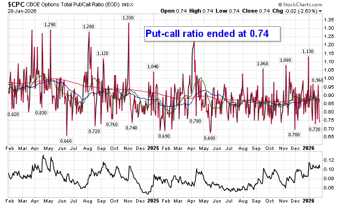 Sentiment on Wednesday, as gauged by the put-call ratio, ended bullish at 0.74.