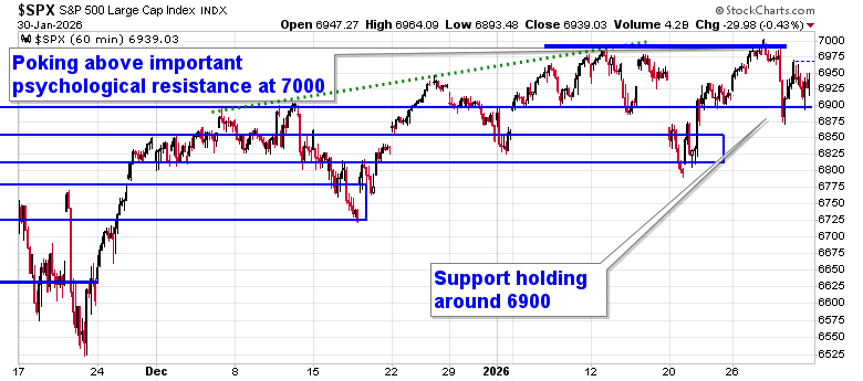 A pop of the bubble in the precious metal market following the announcement of the new Fed chair nominee had traders trimming equity positions ahead of the close of the month. The S&P 500 Index closed down by just over four-tenths of one percent, pulling back from the all-time intraday high achieved on Wednesday around 7000; the market is highlighting the importance of this level of psychological resistance, presenting the risk of revealing a double-top. Short-term support around 6900 remains intact, defining more of a trading range between this and the aforementioned all-time peak. Previous October gap resistance turned support around 6830 has been keeping us engaged with equity exposure until definitively broken. We remain on the lookout for a potential shift of the market’s character ahead where levels of resistance hold greater weight than support and, while the very recent price action has provided hints of this, nothing definitive has been revealed yet to shake us loose of our equity exposure; should a topping pattern become confirmed, looking to trim equity exposure will become prudent, bracing for the kind of volatility that is average around this time of year. When it comes to the price action at the very end of the month, the moves must be definitive, looking past the noise attributed to end of month trading. In the Seasonal Advantage Portfolio that we oversee at CastleMoore, there have been no trades that have been considered to be required and we continue to benefit from our pro-cyclical and commodity oriented stance (many of which were positive last week, overall). We continue to tailor towards the themes in our chart books to either Accumulate or Avoid that have been capturing the strength and rotation that has filtered into the market from the November 20th lows.