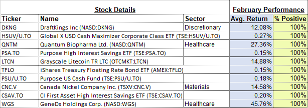 - Securities that have gained or lost in every February
