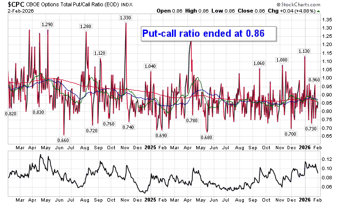 Sentiment on Monday, as gauged by the put-call ratio, ended bullish at 0.86.