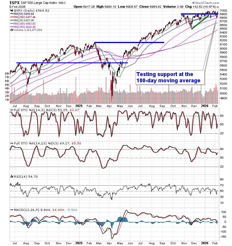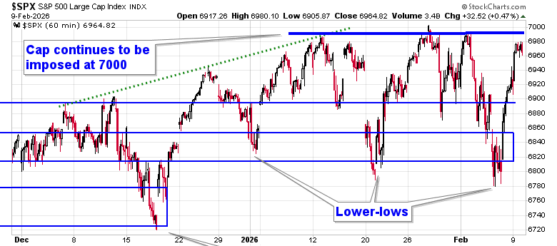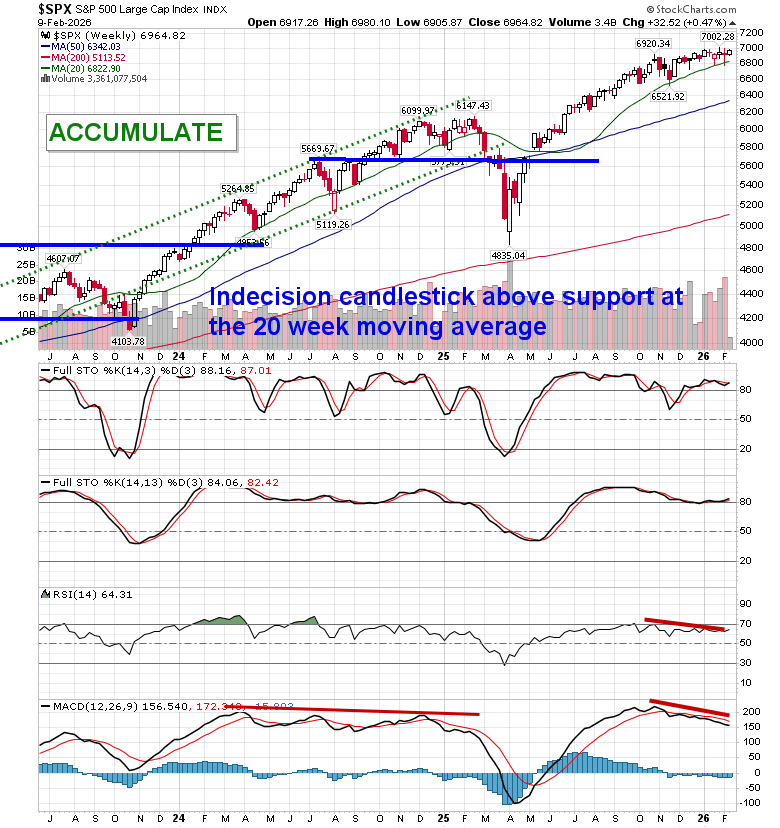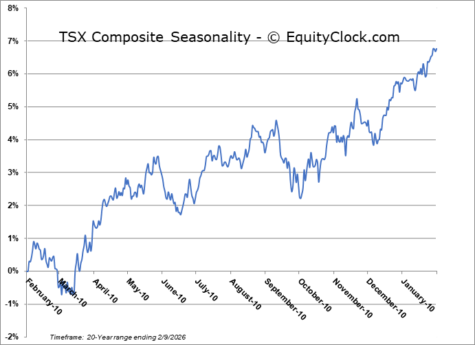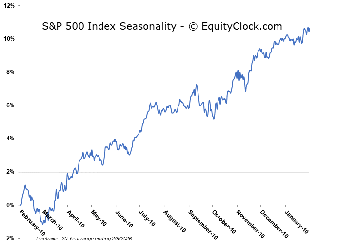 Stocks stabilized from last week’s technology/crypto fuelled selloff to close higher in the first session of the new week as market participants await some key economic data points through the days ahead (eg. Non-Farm Payrolls, Consumer Price Index).  The S&P 500 Index added just less than half of one percent, reaching back towards the cap that has been imposed on the benchmark for the past few weeks around 7,000. A slight negative skew remains with highs fixed around aforementioned resistance and lower-lows recorded since the year began.   Nothing extreme has developed, yet, and the benchmark remains within arm’s reach of the all-time high charted less than two weeks ago. Threats remain for a downside resolution to 6730, or the mid-December lows, particularly through the period of seasonal weakness for stocks that is average later in February.  The character of the market seems to have shifted where levels of resistance (at least on this tech heavy benchmark) are holding greater weight than levels of support. Looking to trim equity exposure in this backdrop, until resolved, has become prudent, pulling back the elevated levels of exposure that were held through the Santa Claus rally period and into the first month of the year, bracing for the kind of volatility that is average later in February.  In the Seasonal Advantage Portfolio that we manage for clients at CastleMoore, we have taken action to align with the risks that are creeping into the market ahead of the average mid-February peak in stocks, but, we have not been enticed, yet, to abandon our pro-cyclical and commodity oriented stance that has been flourishing this year. Themes in our chart books to either Accumulate or Avoid continue to gear towards the trends that are working and intact.