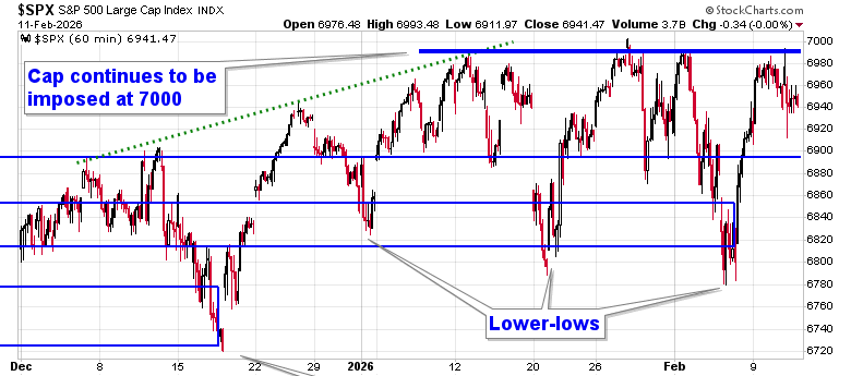 Stocks traded mixed for a second day as investors showed a muted reaction to January’s Non-Farm Payroll report. The S&P 500 Index was essentially unchanged, once again reacting to the cap that has been imposed on the benchmark around 7,000. A slight negative skew remains with highs fixed around aforementioned resistance and lower-lows recorded since the year began. Nothing extreme has developed, yet, and the benchmark remains within arm’s reach of the all-time high charted less than two weeks ago. Threats remain for a downside resolution to 6730, or the mid-December lows, particularly through the period of seasonal weakness for stocks that is average later in February. The character of the market seems to have shifted where levels of resistance (at least on this tech heavy benchmark) are holding greater weight than levels of support. Looking to trim equity exposure in this backdrop, until resolved, has become prudent, pulling back the elevated levels of exposure that were held through the Santa Claus rally period and into the first month of the year, bracing for the kind of volatility that is average later in February. In the Seasonal Advantage Portfolio that we manage for clients at CastleMoore, we have taken action to align with the risks that are creeping into the market ahead of the average mid-February peak in stocks, but, we have not been enticed, yet, to abandon our pro-cyclical and commodity oriented stance that has been flourishing this year. Themes in our chart books to either Accumulate or Avoid continue to gear towards the trends that are working and intact.