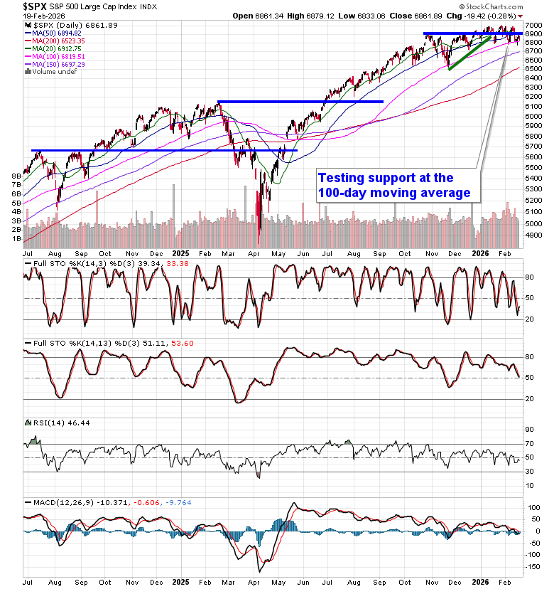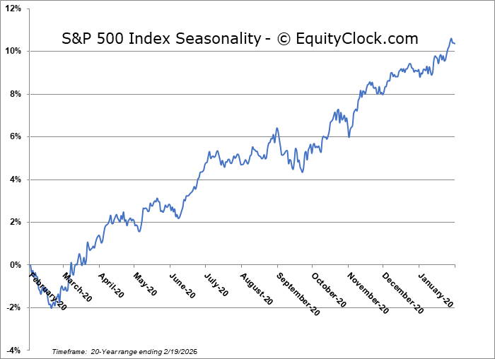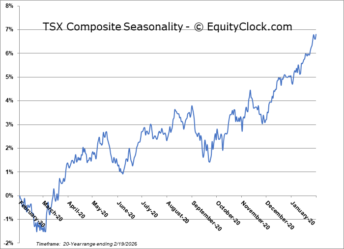 Stocks slipped on Thursday as a selloff in financials and geopolitical concerns pertaining to a possible attack against Iran has investor on edge.  The S&P 500 Index fell by just less than three-tenths of one percent after testing a point of horizontal resistance at 6900 on Wednesday.  A slight negative skew remains with highs fixed around 7,000 and lower-lows recorded since the year began.   Nothing extreme has developed, yet, and the benchmark remains within arm’s reach of the all-time high charted a few weeks ago. Threats remain for a downside resolution to 6730, or the mid-December lows, particularly through the period of seasonal weakness for stocks that is average at this time of year.  The character of the market seems to have shifted where levels of resistance (at least on this tech heavy benchmark) are holding greater weight than levels of support. Looking to trim equity exposure in this backdrop, until resolved, has become prudent, pulling back the elevated levels of exposure that were held through the Santa Claus rally period and into the first month of the year, bracing for the kind of volatility that is average through the next few weeks.  In the Seasonal Advantage Portfolio that we manage for clients at CastleMoore, we have taken action to align with the risks that are creeping into the market ahead of this average mid-February peak in stocks, but, we have not been enticed, yet, to abandon our pro-cyclical and commodity oriented stance that has been flourishing this year. Themes in our chart books to either Accumulate or Avoid continue to gear towards the trends that are working and intact.