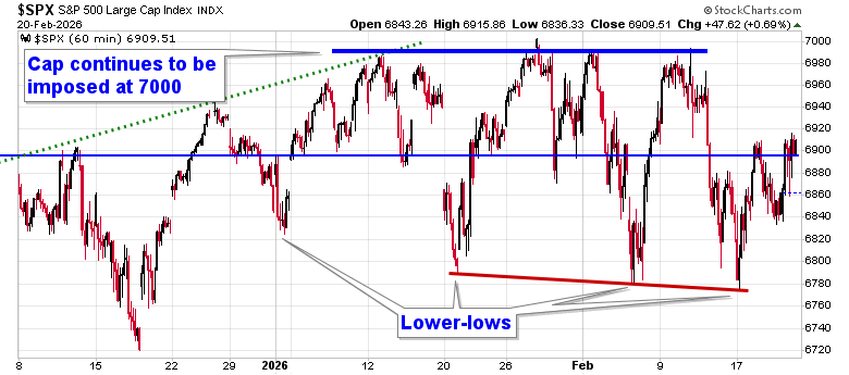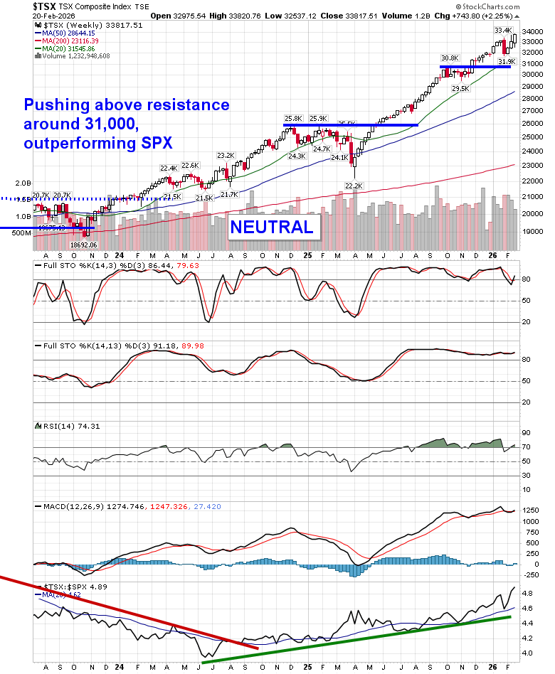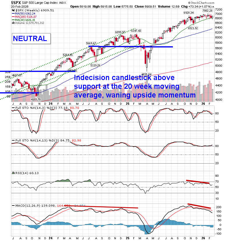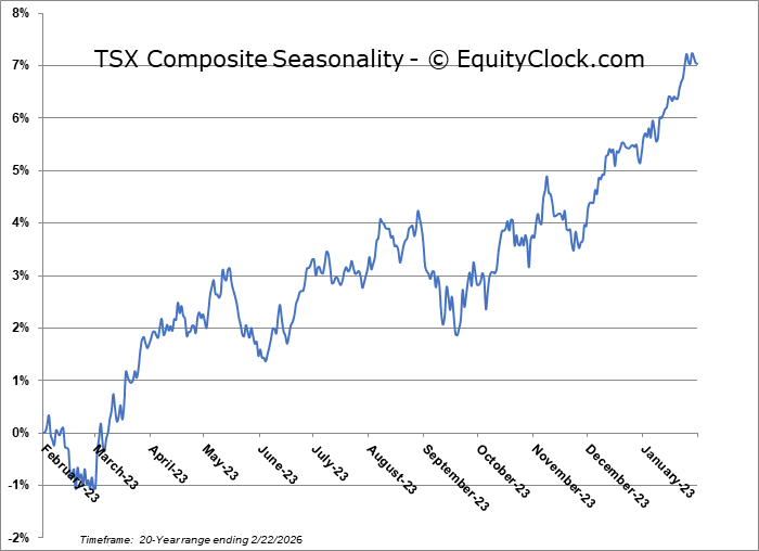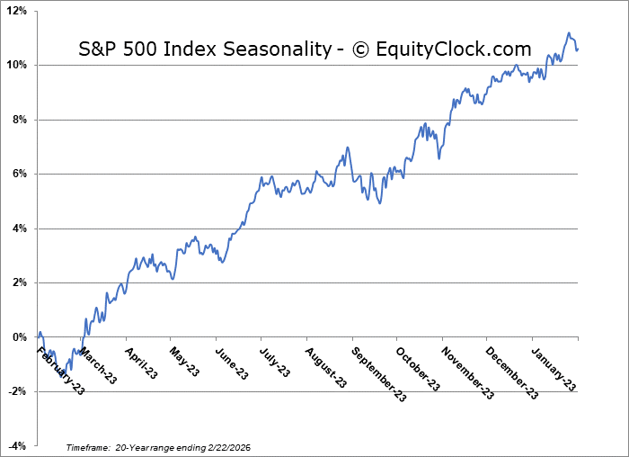 Stocks moved higher on Friday as traders reacted positively to the US Supreme Court ruling that struck down tariffs imposed by the Trump administration. The S&P 500 Index gained nearly seven-tenths of one percent, once again intersecting a point of horizontal resistance at 6900. A slight negative skew remains with highs fixed around 7,000 and lower-lows recorded since the year began. Nothing extreme has developed, yet, and the benchmark remains within arm’s reach of the all-time high charted a few weeks ago. Threats remain for a downside resolution to 6730, or the mid-December lows, particularly through the period of seasonal weakness for stocks that is average at this time of year. The character of the market seems to have shifted where levels of resistance (at least on this tech heavy benchmark) are holding greater weight than levels of support. Looking to trim equity exposure in this backdrop, until resolved, has become prudent, pulling back the elevated levels of exposure that were held through the Santa Claus rally period and into the first month of the year, bracing for the kind of volatility that is average through the next couple of weeks. In the Seasonal Advantage Portfolio that we manage for clients at CastleMoore, we have taken action to align with the risks that are creeping into the market ahead of this average mid-February peak in stocks, but, we have not been enticed, yet, to abandon our pro-cyclical and commodity oriented stance that has been flourishing this year. Themes in our chart books to either Accumulate or Avoid continue to gear towards the trends that are working and intact.