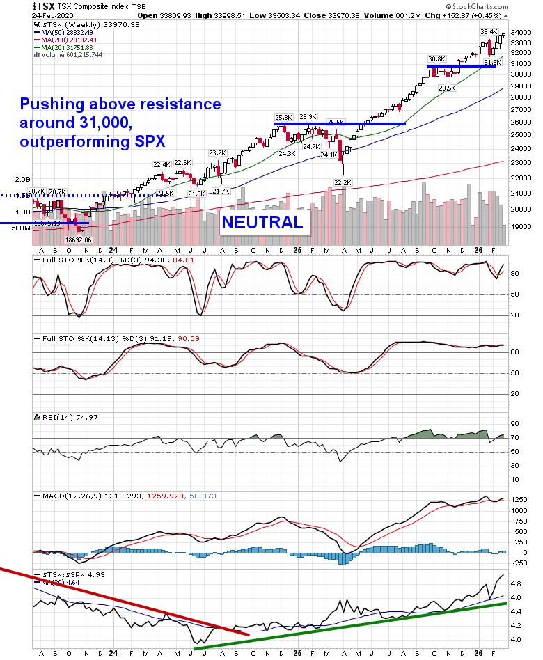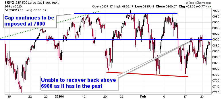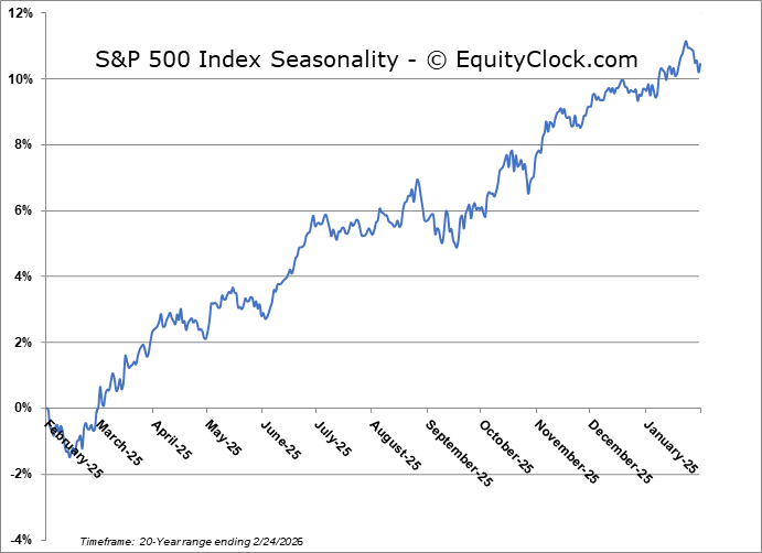 Stocks recovered on Tuesday as investors sought to neutralize portfolios ahead of the State of the Union address and the release of earnings from Nvidia (NVDA) after Wednesday’s closing bell. The S&P 500 Index closed with a gain of just over three-quarters of one percent, taking another swing at resistance at the 20-day moving average (~6905) that has been derived in recent days. Horizontal resistance at 6900 remains an important pivot point and the inability of the benchmark to sustain levels above this threshold in recent days increases the likelihood that we see a downside resolution to our target of 6730, or the mid-December lows, during this normally weak timeframe in the equity market. Levels of resistance continue to show evidence of holding greater weight than support. Looking to trim equity exposure in this backdrop, until resolved, has become prudent, pulling back the elevated levels of exposure that were held through the Santa Claus rally period and into the first month of the year, bracing for the kind of volatility that is average at this time of year. In the Seasonal Advantage Portfolio that we manage for clients at CastleMoore, we have taken action to align with the risks that were creeping into the market ahead of this average mid-February peak in stocks, but, we have not been enticed, yet, to abandon our pro-cyclical and commodity oriented stance that has become reinvigorated again in recent days. Themes in our chart books to either Accumulate or Avoid continue to be appropriately dialed in to the trends that are working and intact.