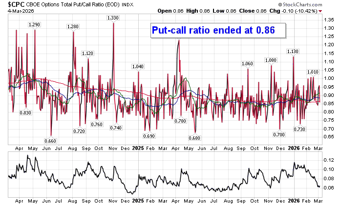 Sentiment on Wednesday, as gauged by the put-call ratio, ended bullish at 0.86.