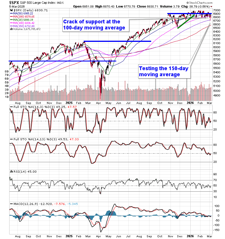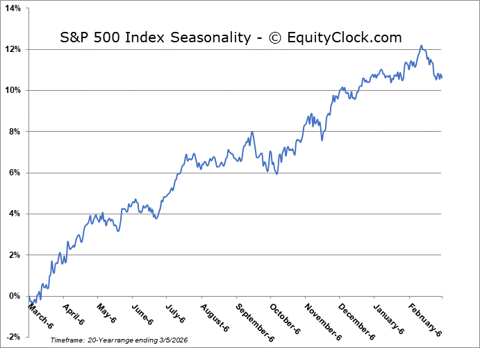 Renewed volatility amidst the ongoing rise in the price of oil had traders booking profits in many of their winners from this year as market participants look to manage their overall risk profile.  The S&P 500 Index shed just over half of one percent, continuing to wobble below the important 6900 pivot point that we have highlighted in our reporting.  Levels of resistance overhead remain heavy and, still, there is certainly no evidence that selling pressures have concluded. The 100-day moving average for the large-cap benchmark (6836) that was providing significant support has been cracked, putting the 150-day and 200-day moving averages in play (6732 and 6578, respectively).  A sustained break of horizontal support around 6800 would violate an approximately 200-point range from the last few months, proposing a downside target of 6600.  So long as strains against the market continue, traders looking to ramp up exposure in portfolios should be on the lookout for a washout event where weak hands are shaken loose of present holdings and a reset is presented.  We are not there yet.  In the Seasonal Advantage Portfolio that we manage for clients at CastleMoore, we have been balancing the near-term risk-reward in the market, barbelling low volatility plays with pro-cyclical/commodity oriented bets, an approach that continues align with the trends in the market.  We look forward to being able to ramp up risk exposure again at more favourable levels for the strength that is normal of equity markets in late March and through the month of April.  Subscribers can view the themes in our chart books to either Accumulate or Avoid that are working and intact.
