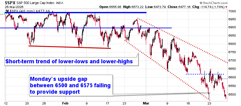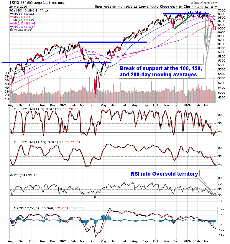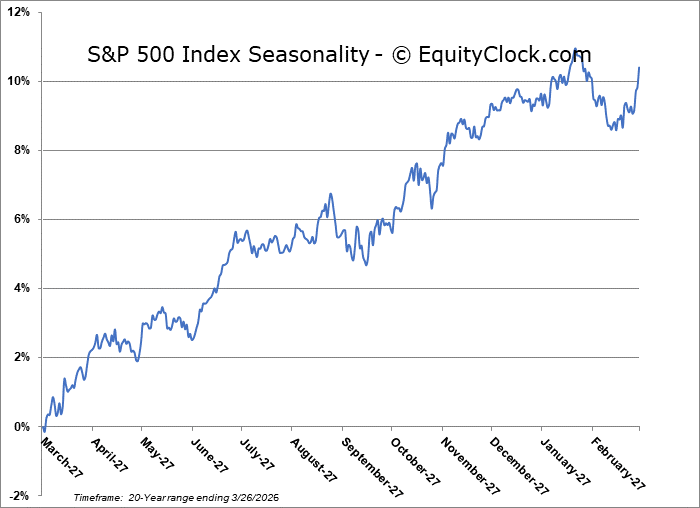 Stocks lost ground on Thursday as the price of oil and interest rates spiked amidst ongoing uncertainty pertaining to the conflict in Iran. The S&P 500 Index closed down by 1.74%, cracking below substantial upside gap charted at Monday’s open between 6500 and 6575 and reaching back to Friday’s low; the benchmark continues to struggle to derive a durable level/zone as support. The limits of the declining trend channel continue to be respected (lower limit was tested on Friday) and the band between 6500 and 6600 that we have speculated as likely to provide support has developed a crack following Thursday’s price action. While the short-term technicals are presenting renewed concern and the longer-term technical profile of the market has become threatening, we still have a focus on the near-term positivity in equity markets heading into the seasonally strong period during the month of April. In the Seasonal Advantage Portfolio that we manage for clients at CastleMoore, we rotated away from our low volatility posture and added to risk exposure at the end of last week for the seasonally strong window that runs through the next four to six weeks. The conflict in Iran remains a wildcard and we are running down our cues that would warrant a more defensive posture in risk assets, but the net of all developments following Thursday’s action between technicals, fundamentals, and seasonals for the near-term continue to provide the edge to an upside bias. Subscribers can view the themes in our chart books to either Accumulate or Avoid that are working and intact.