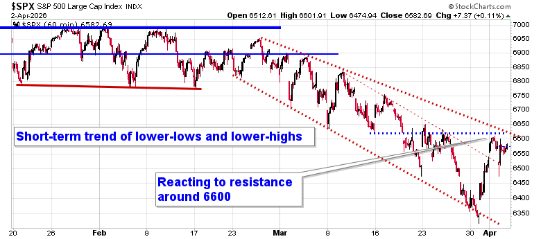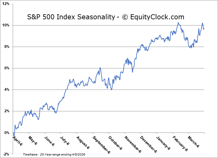 Perhaps to the shock of many, stocks closed higher on Friday as traders shook off concerns pertaining to surging oil prices. The S&P 500 Index added just over a tenth of one percent, continuing to move higher from levels around the lower limit of the declining trend channel that has been playing out over the past month. An alleviation of the parabolic decline from recent days is being offered. The benchmark continues to push against the upper limit of its declining span, as well as horizontal resistance from the past couple of weeks, around 6620, reaction to which has been observed; the benchmark is at a make or break point to the rebound that has elevated stocks into the start of this seasonally strong month of April. A short-term trend of lower-highs and lower-lows remains intact and major daily moving averages continue to provide formidable hurdles for the benchmark to overcome in order to sustain the recovery through the weeks ahead. Market participants are watching the 200-day moving average (currently at 6644) like a hawk, emphasizing that “nothing good happens below this level.” However, with this negativity that investors have adopted around this important technical hurdle, we cannot dismiss the prospect of a contrarian move above the threshold that shakes the negative sentiment of many and draws traders back in before what could be another round of weakness in equity markets later this spring (aligned with how stocks perform in mid-term election years under a new presidential party). In the Seasonal Advantage Portfolio that we manage for clients at CastleMoore, we have been playing the contrarian after rotating away from our low volatility posture and adding to risk exposure a week and a half ago for the seasonally strong window that runs through the next two to four weeks. The conflict in Iran remains a wildcard and we are running down our cues that would warrant a more defensive posture in risk assets, but the net of all developments following the action from the past couple of weeks between technicals, fundamentals, and seasonals for the near-term continue to provide the edge to an upside bias (and it has been working). Subscribers can view the updated list of themes in our chart books to either Accumulate or Avoid that we continue to gear portfolios towards.