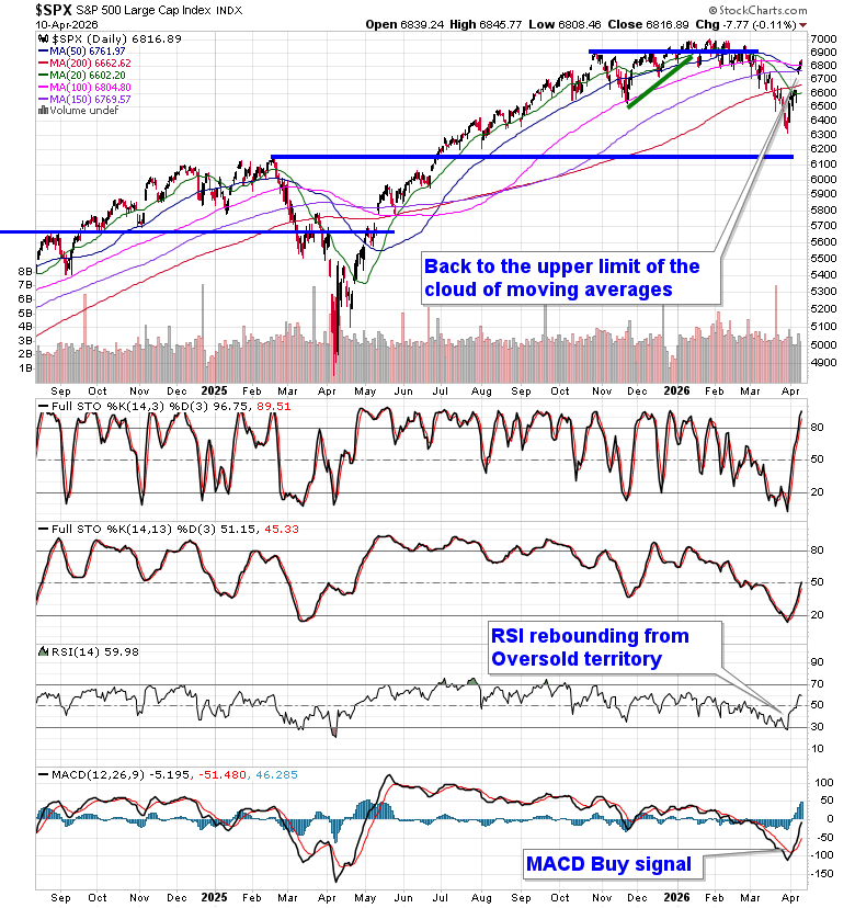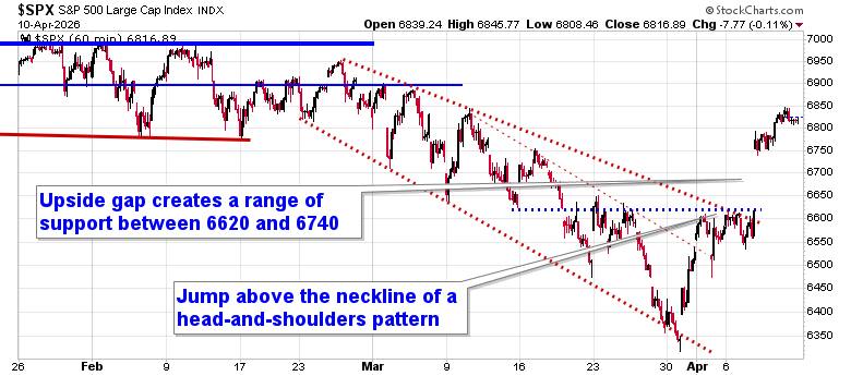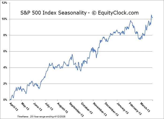 Stocks slipped slightly on Friday developments pertaining to the Iran ceasefire continue to be monitored. The S&P 500 Index closed down by a tenth of a percent, leaving Wednesday’s gap that was opened between 6620 and 6740 unfilled. A head-and-shoulders bottoming pattern that saw its neckline around 6620 remains in play, a technical setup that proposes an upside resolution to 6900, or back to the important pivot point in the market that we had highlighted in January and February. A fill of the open gap is still a probability before the upside target that the bullish setup projects is achieved, but it seems likely that the reaction to earnings through the weeks ahead will dictate whether this gap fill comes sooner or later. The 200-day moving average, which had been heavily scrutinized by many in recent weeks, has been retaken and the upper limit of the cloud of moving averages at 6800 is being tested. In the Seasonal Advantage Portfolio (which is strongly higher YTD and back to its high watermark that was charted in February) that we manage for clients at CastleMoore, we continue to be fully exposed to risk (stocks) after flipping from our low volatility stance around the end of March and our performance is benefitting. The conflict in Iran remains a wildcard and we are running down our cues that would warrant a more defensive posture in risk assets, but the net of all developments following the action from the past couple of weeks between technicals, fundamentals, and seasonals have provided the edge to an upside bias (and it has been working). Subscribers can view the updated list of themes in our chart books to either Accumulate or Avoid that we continue to gear portfolios towards.