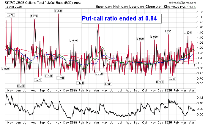 Sentiment on Monday, according to the put-call ratio, ended bullish at 0.84.