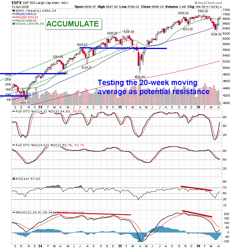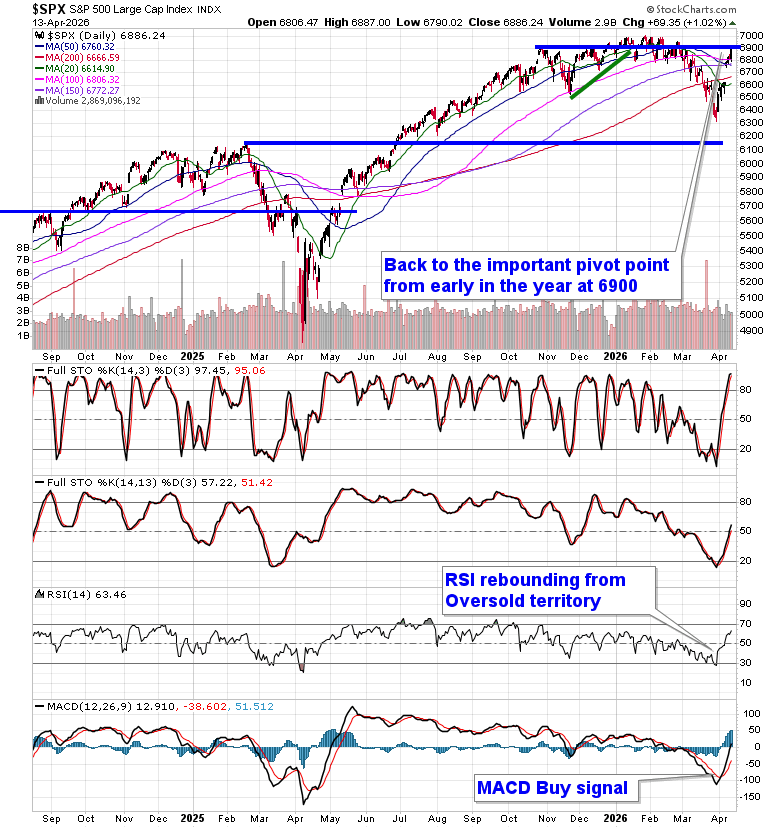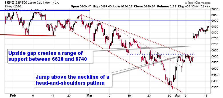 Stocks shook off concerns related to a failure to achieve a peace deal between the US and Iran over the weekend, trading high and fueling short covering in some of the most beaten down segments of the market (eg. Software, Private Equity Managers). The S&P 500 Index closed up by just over one percent, leaving last Wednesday’s gap that was opened between 6620 and 6740 unfilled. A head-and-shoulders bottoming pattern that saw its neckline around 6620 remains in play, a technical setup that proposes an upside resolution to 6900, or back to the important pivot point in the market that we had highlighted in January and February. This hurdle is now mere points away. The benchmark is marginally above the upper limit of the cloud of moving averages at 6800. In the Seasonal Advantage Portfolio (which is strongly higher YTD and back to its high watermark that was charted in February) that we manage for clients at CastleMoore, we continue to be fully exposed to risk (stocks) after flipping from our low volatility stance around the end of March and our performance is benefitting. The conflict in Iran remains a wildcard and we are running down our cues that would warrant a more defensive posture in risk assets. Last week, for the first time in a long time, our chart books leaned negative, providing segments of the market that are providing setups to shoot against (short). Subscribers can view the updated list of themes in our chart books to either Accumulate or Avoid that we continue to gear portfolios towards.