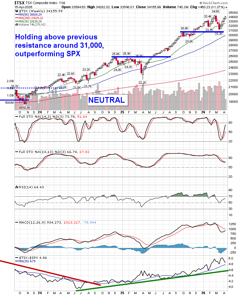 Stocks remained unrelenting in their climb with the major market benchmarks in the US (S&P 500, Nasdaq) back into record high territory. The S&P 500 Index closed up by eight-tenths of one percent, exceeding the previous peak that was charted in January around 7,000. A number of gaps remain unfilled below, including the big one between 6620 and 6740, but, ultimately, the character of the market has changed where levels of resistance hold less weight than levels of support. A small upside gap opened on Tuesday between 6885 and 6905 is the first zone to watch for reaction as potential support on a retracement/digestion of recent gains. Momentum indicators continue to rise and there is no actionable evidence that the recovery from the March low has matured. In the Seasonal Advantage Portfolio (which is strongly higher YTD and exceeding its high watermark that was charted in February) that we manage for clients at CastleMoore, we continue to be fully exposed to risk (stocks) after flipping from our low volatility stance around the end of March and our performance is benefitting. The conflict in Iran remains a wildcard and we are running down our cues that would warrant a more defensive posture in risk assets. Subscribers can view the updated list of themes in our chart books to either Accumulate or Avoid that we continue to gear portfolios towards.