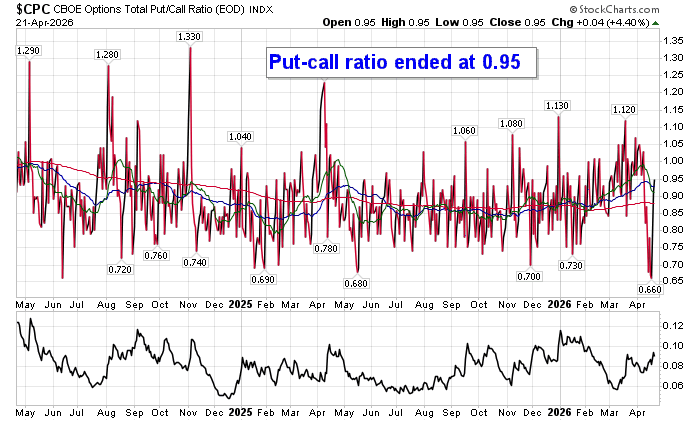 Sentiment on Tuesday, as gauged by the put-call ratio, ended close to Neutral at 0.95.