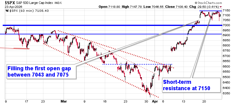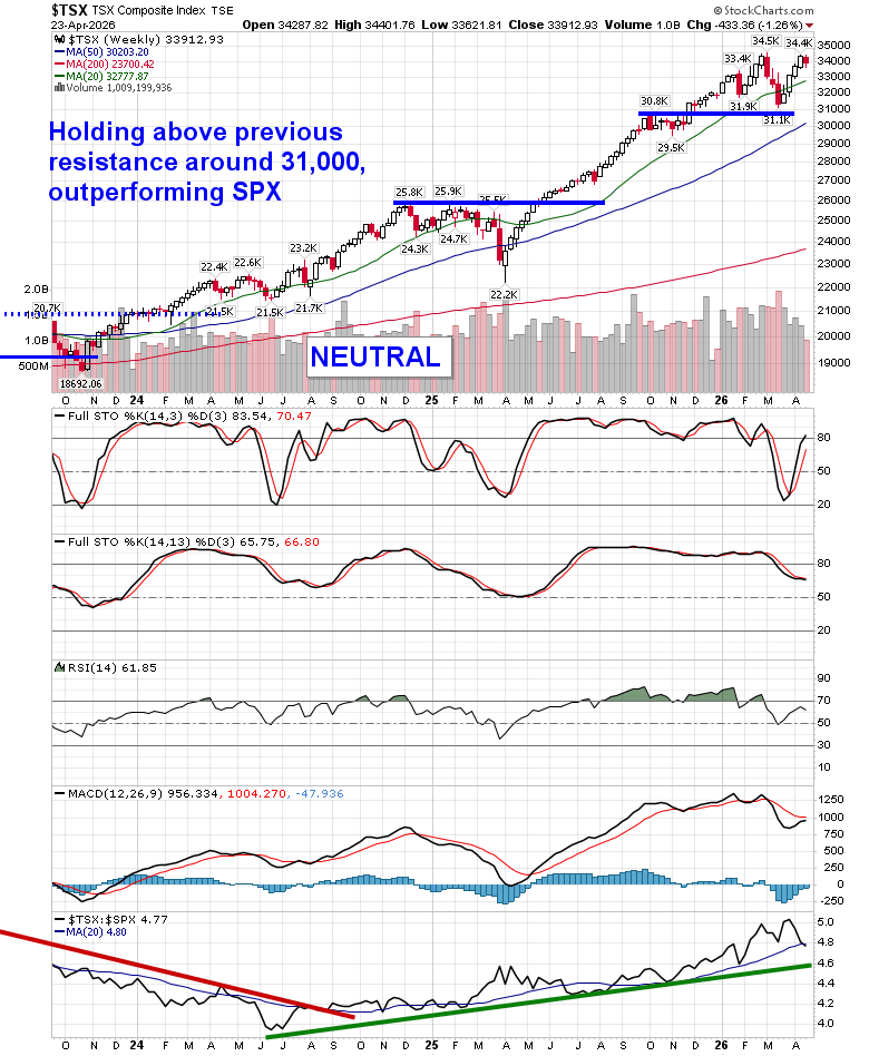 Stocks slipped on Thursday as uncertainty pertaining to the resolution of the conflict in Iran sent the price of Oil higher, elevating the cost of borrowing in the process. The S&P 500 Index ended lower by just over four-tenths of one percent, increasingly deriving a short-term cap around 7150. A number of gaps remain unfilled below, including the big one between 6620 and 6740, but, ultimately, the character of the market has changed where levels of resistance hold less weight than levels of support. A break below Friday’s gap support would open the door to the gap between 6885 and 6905 that was opened a week ago Tuesday. Momentum indicators have been rolling over from overbought territory, highlighting the upside exhaustion that we had been noting in recent days. In the Seasonal Advantage Portfolio (which is strongly higher YTD, continuing to set new high watermarks) that we manage for clients at CastleMoore, we continue to be fully exposed to risk (stocks) after flipping from our low volatility stance around the end of March and our performance is benefitting. The conflict in Iran remains a wildcard and we are running down our cues that would warrant a more defensive posture in risk assets. While we do not have the signals to sell equity exposure, some portfolio hedges here are probably prudent and we implemented some of those during the Wednesday session, based on what we reported on in our April 22 Market Outlook. Subscribers can view the themes in our chart books to either Accumulate or Avoid that we continue to gear portfolios towards.