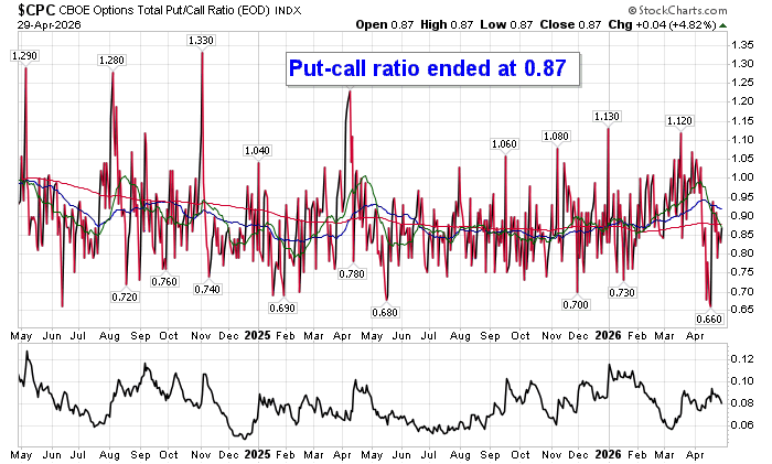 Sentiment on Wednesday, as gauged by the put-call ratio, ended bullish at 0.87.