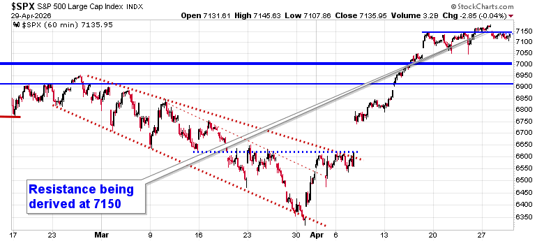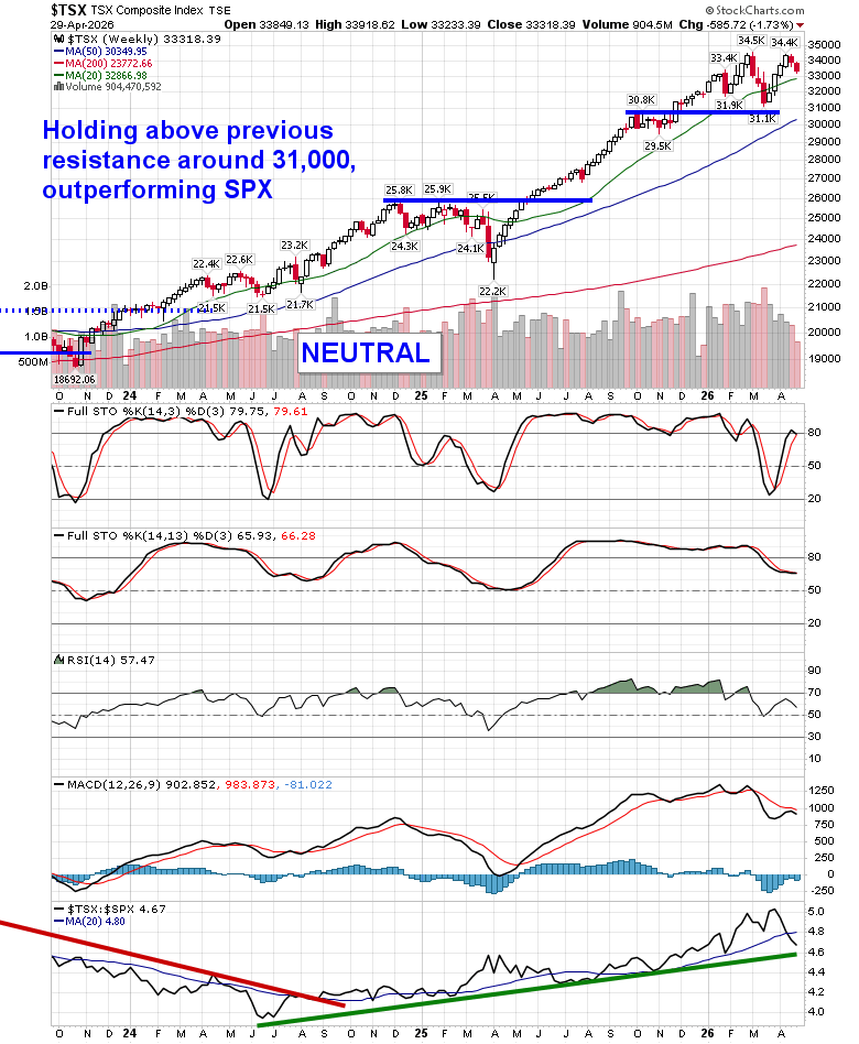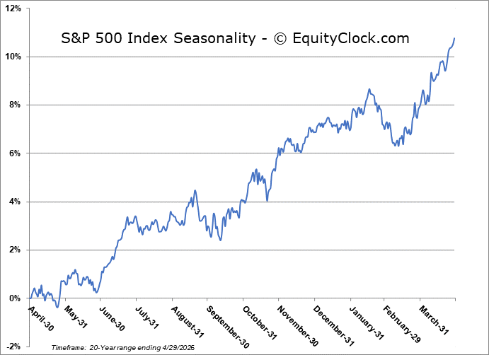 Ongoing strength in the price of oil continues to cap the near-term upside momentum in the equity market as traders hold the tape fairly steady surrounding earnings reports from a number of tech titans. The S&P 500 Index ended nearly unchanged, staying below the downside gap charted in the previous session around resistance at 7150. A number of gaps remain unfilled below, including the big one between 6620 and 6740, but, ultimately, the character of the market has changed where levels of resistance hold less weight than levels of support. Downside risks in the near-term can be pegged towards levels around 6900, but, we are still playing with a positive side bias (albeit with hedges that have been added in recent days – see our April 22 Market Outlook). Momentum indicators have been rolling over from overbought territory, highlighting upside exhaustion and lending themselves to the prospect of a digestive phase on the horizon, particularly once we get beyond the height to earnings season this week. In the Seasonal Advantage Portfolio (which is strongly higher YTD, continuing to set new high watermarks) that we manage for clients at CastleMoore, we continue to be fully exposed to risk (stocks) after flipping from our low volatility stance around the end of March and our performance is benefiting. The conflict in Iran remains a wildcard and we are running down our cues that would warrant a more defensive posture in risk assets. Subscribers can view the themes in our chart books to either Accumulate or Avoid that we continue to gear portfolios towards.